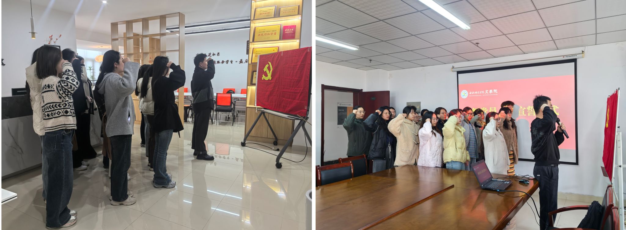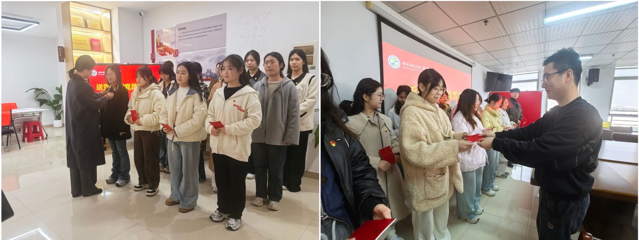 根据学院党员发展工作安排,12月10日中午,英国威廉希尔公司2025年下半年新党员入党宣誓仪式分别在锦绣校区学院会议室、滨湖校区“集萃文苑”一站式社区同步举行,学院党委书记许锃、副书记夏娟、各学生党支部书记以及下半年新发展党员参加。党支部书记疏淑进、曹甜甜分别在两校区主持宣誓仪式。