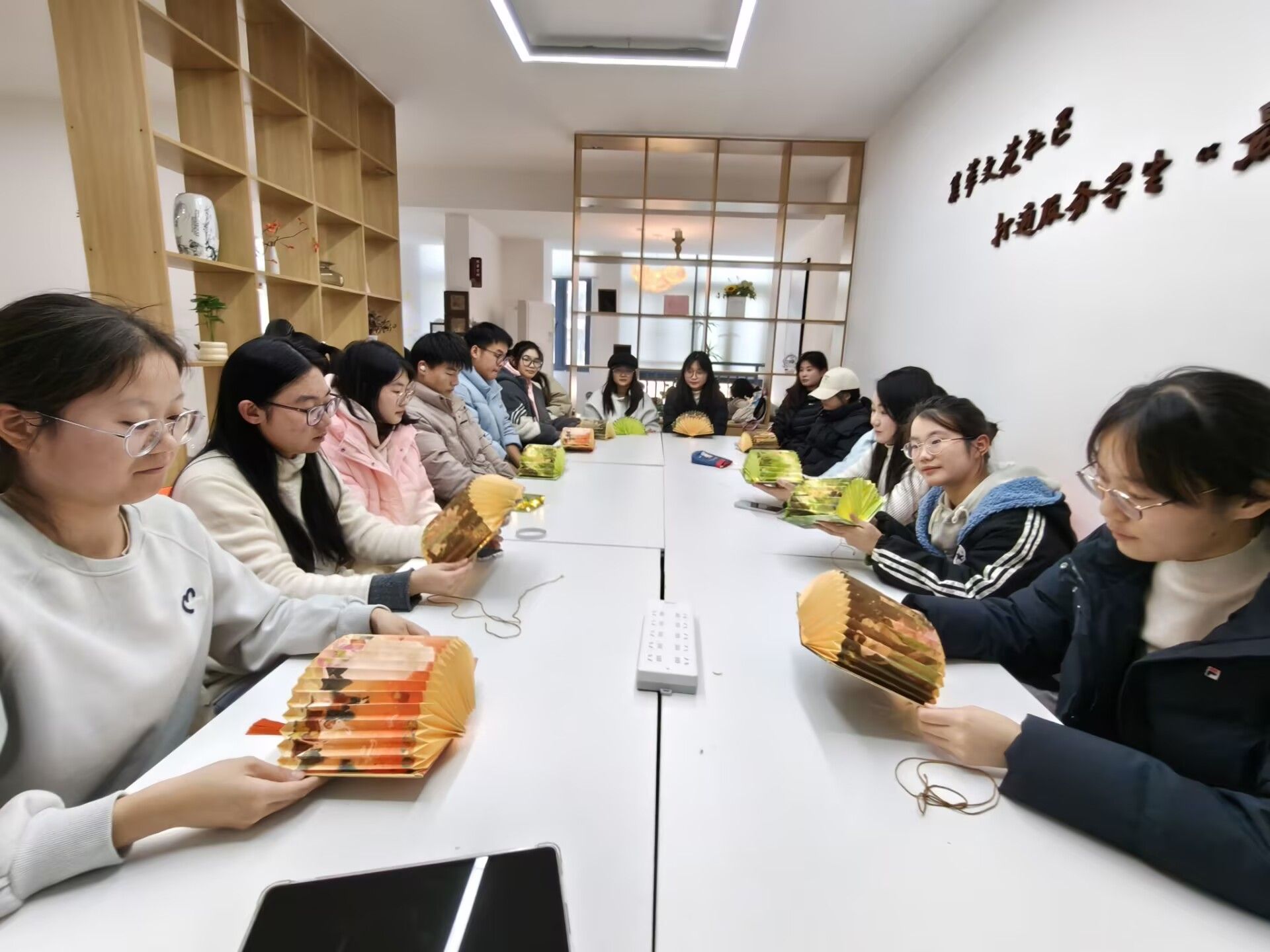 活动现场秩序井然,氛围温馨。工作人员介绍了冬至节气的历史渊源与传统习俗,加深了大家对这一节气的文化理解,并带领现场的同学们通过观看提前录制的手工教学视频,逐步学习纸质灯笼的制作方法。视频讲解清晰、节奏适宜,为后续的动手环节奠定了良好基础。